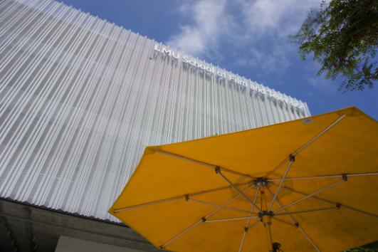 Seasonal brise‑soleil facade panels reduce heat gain while providing shaded outdoor seating and visual openness